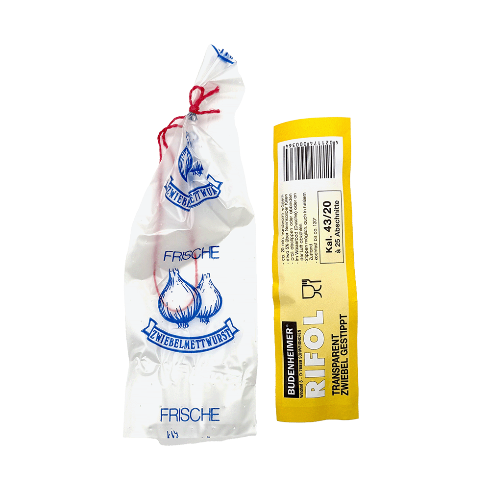 Produktinformationen "Budenheimer Rifol transparent, Zwiebelmettwurst, 43/20 gelocht, 25 Stück pro Bund, Kunstdarm"