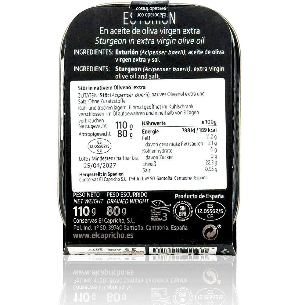 ZUTATEN: Stör (Acipenser Baerii), natives Olivenol extra und Salz. Ohne Zusatzstoffe