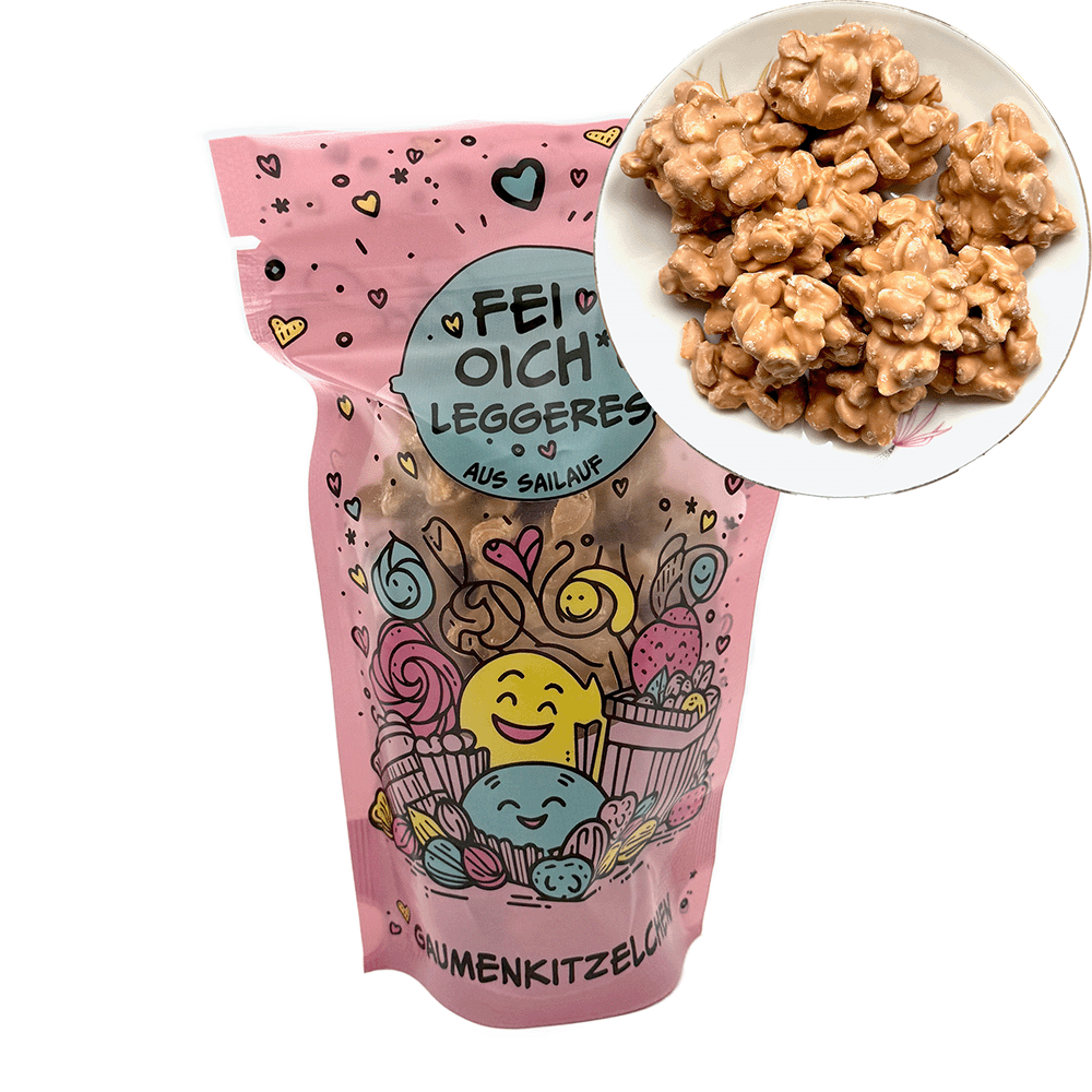Produktinformationen "Schoko-Erdnuss-Brocken mit Salz-Karamell, 100 g, rosa, Gaumenkitzelchen - "Fei Oich Leggeres...""