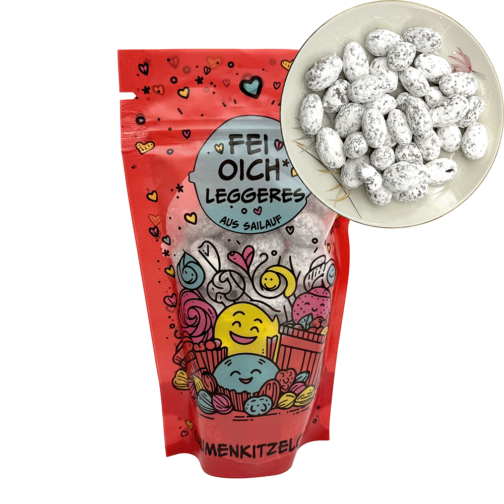 Produktinformationen "Schoko-Schneemandeln 180 g, rot, Gaumenkitzelchen - "Fei Oich Leggeres aus Sailauf""